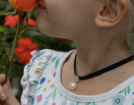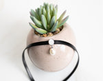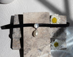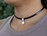 Edgy and glamorous. One perfect AAA quality pearl dangles from a mother of pearl disc on a wide leather strand.