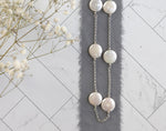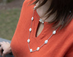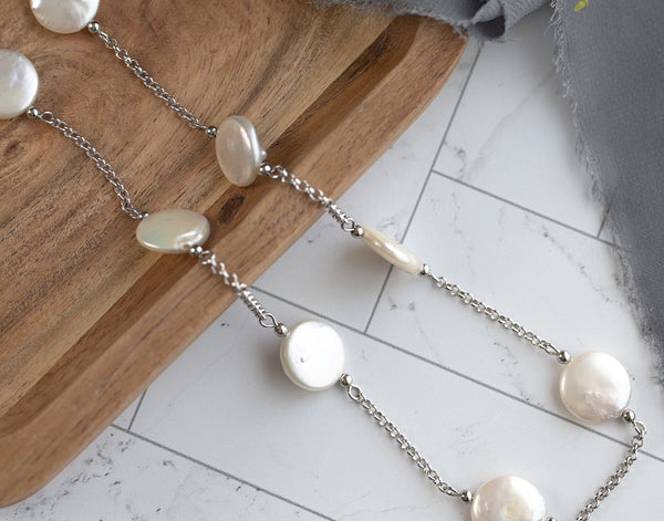 Natural, iridescent coin shaped pearls connected with uniform silver chains.